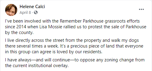 - Why did Supervisors Calci and Higgins feel this proposal needed to be brought in front of the Board? Helene Calci has recently stated on the Remember Parkhouse Facebook page that she has “always—and will continue—to oppose any zoning change from the current institutional overlay.” If this is the case, why didn’t she tell Dr. Rifkin during her “overview” presentation in the fall, in her capacity as Chairman of the Board, that the Township has no appetite for a project that would necessitate a zoning change at the Parkhouse property and that Rifkin should come back instead with a conforming use?