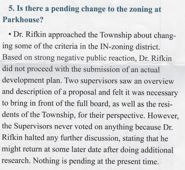 - The statement that Dr. Rifkin “might” return at a later date after doing additional research is completely made up and not based on any statement that Rifkin made in his letter. In his letter, Rifkin states, “We are not ready to present any actual plan for the parcel to the Township or the Board of Supervisors. We will absorb input received and at some point, in the future, come back to you with an updated draft concept or with an actual proposal.” There is no “might” or “maybe” in that statement. Dr. Rifkin was adamant at the January Board meeting that he had a right to develop the land. He will be back.
