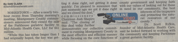 When the County first decided to sell Parkhouse, the reason Josh Shapiro et al gave was because the County wanted to focus on “core functions” and the Parkhouse Assisted Living Center was losing money to the tune of millions per year. (no financial evidence of this claim was ever produced by the Commissioners, by the way). The County was left in a fiscal mess, you see, and Josh Shapiro had to clean it up. There were higher offices to pursue.