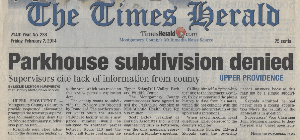 Gentle Readers, please indulge your Humble Blogress for a moment to read the following short Times Herald article, dated February7, 2014, detailing the Township’s denial of the County’s subdivision request, and I’ll meet you on the other side. (click on the images to embiggen)
