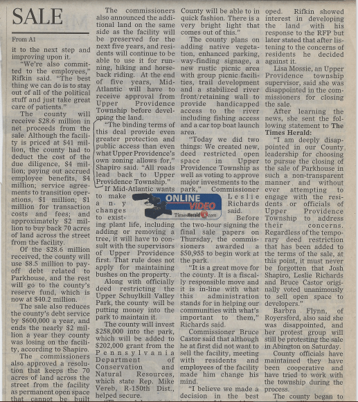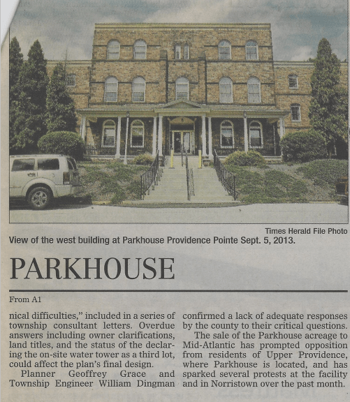 “The other thing I wanted to do was bring to people’s attention the article in the Times Herald dated March 6, 2014. It is an article about Parkhouse. And I want to bring to your attention one particular paragraph, and that is, quote, ‘Because Upper Providence would not subdivide the land, the County had to use its power of eminent domain to buy back the land at market price which was valued at $2 million in order to protect it and deed it legally open space.’ That is referring to what is now the Upper Regional—Upper Schuylkill Regional Park, but it’s also referring to the other part, the other parcel that was not subdivided off from the facility. And I just want to bring that to people’s attention, and to think about it. Thank you.”