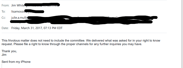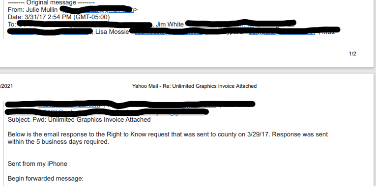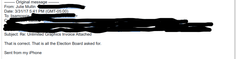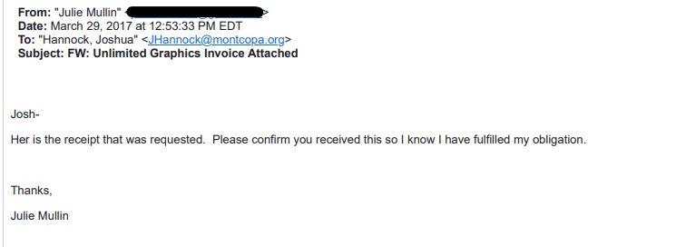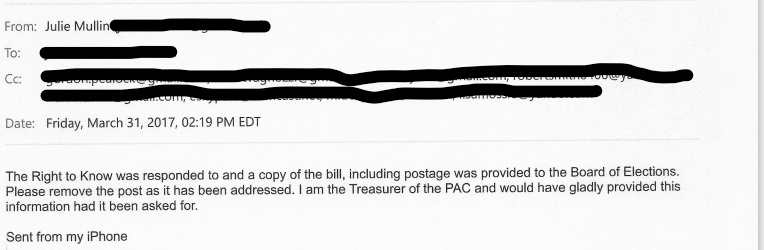 The date of the Work Horse Signs invoice, which we only know because it is listed by Julie Mullin on the Upper Providence First campaign finance report, clearly shows that Julie Mullin had possession of this invoice at the end of March 2017 when I filed my RTK request. And in spite of my follow up email inquiry asking if there was anything else to disclose, she did not provide it to me, choosing instead to hide it from the Right to Know Request.