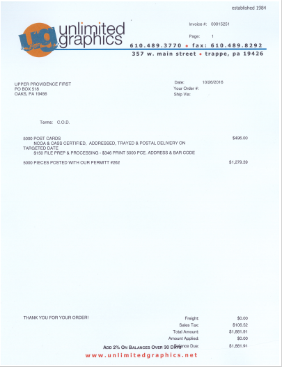 Perhaps the most disturbing thing of all in this whole issue is that Upper Providence First had $991.34 on hand in January 2017, after the 2016 election when the five-member board was passed. Did their treasurer, Upper Providence Tax Collector, Julie Mullin pay at least pay a portion of the bill?