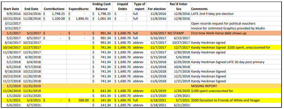 The actual campaign finance reports are linked below. Many of these campaign finance reports are notarized by Mullin’s mother, Kandy Heckman.